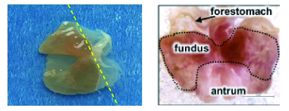 2、沿胃大弯侧剪开胃壁,冰 PBS 冲洗并分离胃体部。去除胃肌层,将剩下的上皮层剪成直径小于 2 mm 大小的碎片。用 10 ml 的移液管将组织碎片的移至 15 ml 离心管中,添加 10 ml 冰 PBS反复吹打重悬,然后让组织碎片自然沉降于管底,弃去约 7.5 ml 的上清。